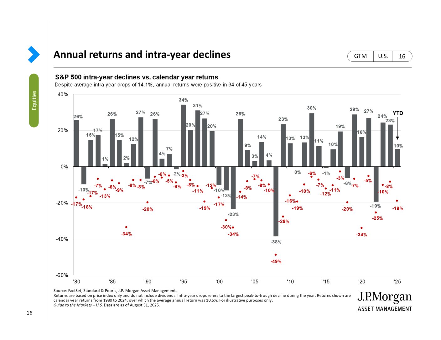 Some years feel like nothing’s growing-bear markets, recessions, surprises. Over long horizons, broad indexes with reinvested dividends have rewarded patience, though the path is never linear. J.P. Morgan’s widely cited “Annual returns and intra‑year declines” chart is a useful visual reminder.